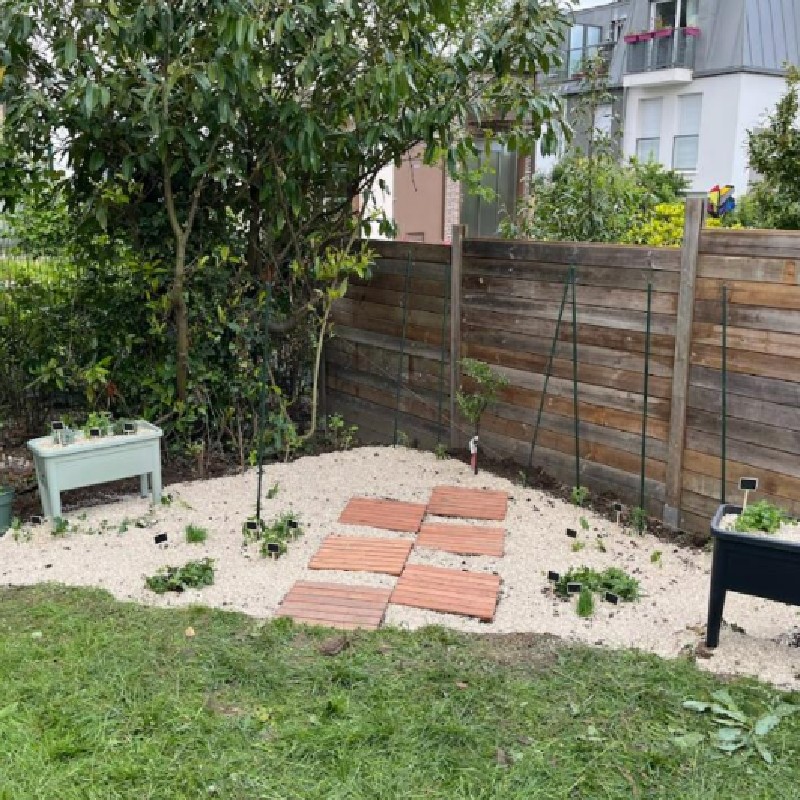 Ce chantier a été l'occasion pour les équipes de Truffaut Boulogne et les participants de Wake Up Café de travailler ensemble à la création d'un espace dédié aux plantes potagères et aromatiques. En collaboration avec les résidents, ils ont aménagé des parcelles de jardin où plusieurs variétés de plantes ont été installées, incluant des tomates, concombres, courgettes, melons, radis, salades, fraisiers, mûres, framboisiers, groseillers, et diverses herbes aromatiques. Des bulbes condimentaires ainsi que des piments et des poivrons ont également été plantés, contribuant à la diversité de cet espace nourricier.